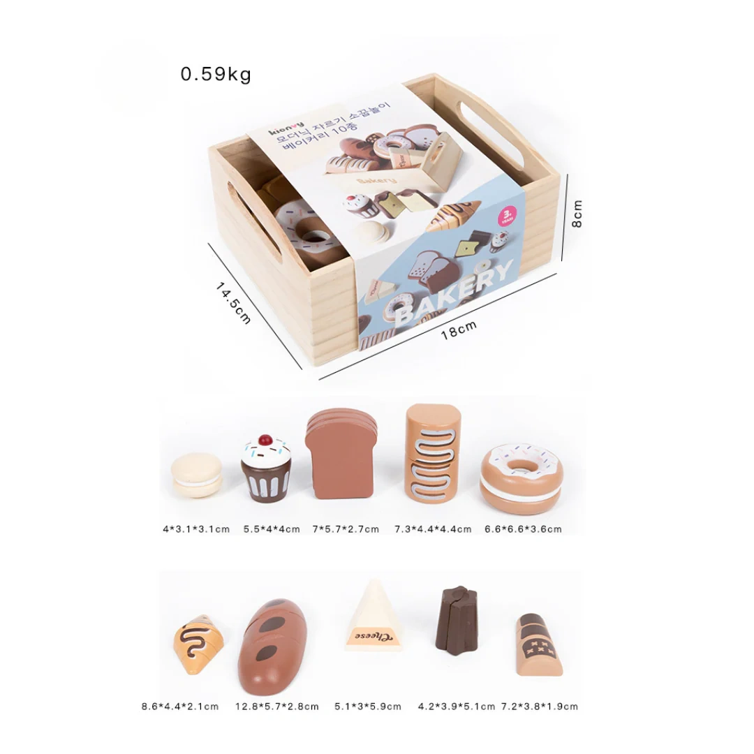 Rich Accessories & Storage Box: Wooden play food set contains 10 kinds of baked breads including doughnut, toast, muffin, pandolo, macaron, conch bread, cheese, baguette, croissant, cake roll, and a wooden storage box with a through handle, which is convenient for organizing toys and can cultivate children's storage habits. Each wooden bakery item in play kitchen food is meticulously designed to reveal detailed cross-sections and internal structures when sliced, achieving remarkable realism.