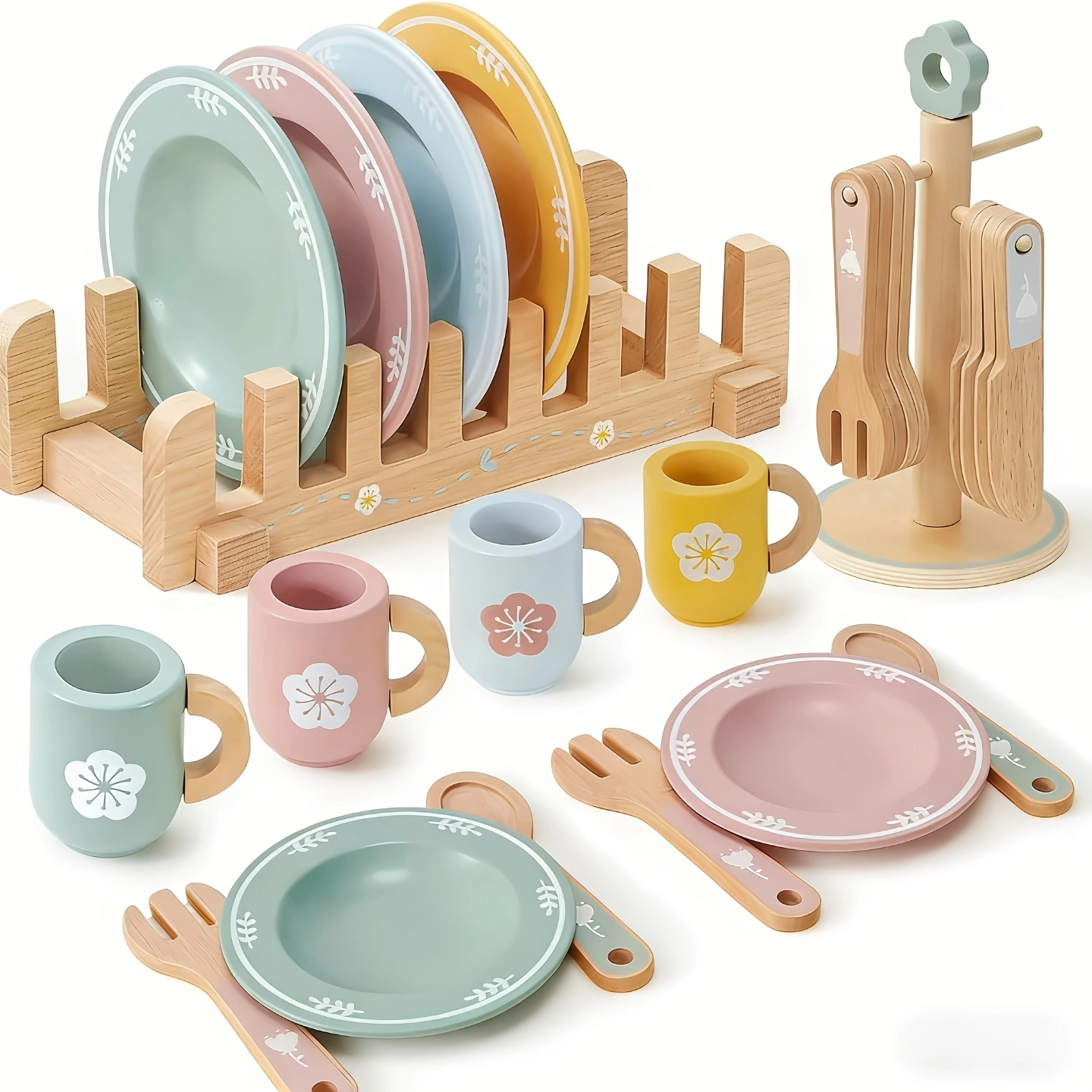 【Complete 22-Piece Play Set】This comprehensive wooden kitchen set includes plates, cups, utensils, and accessory holders that provide everything needed for imaginative play. The variety of pieces enables children to host complete pretend meals while developing organizational skills through realistic role-playing scenarios.